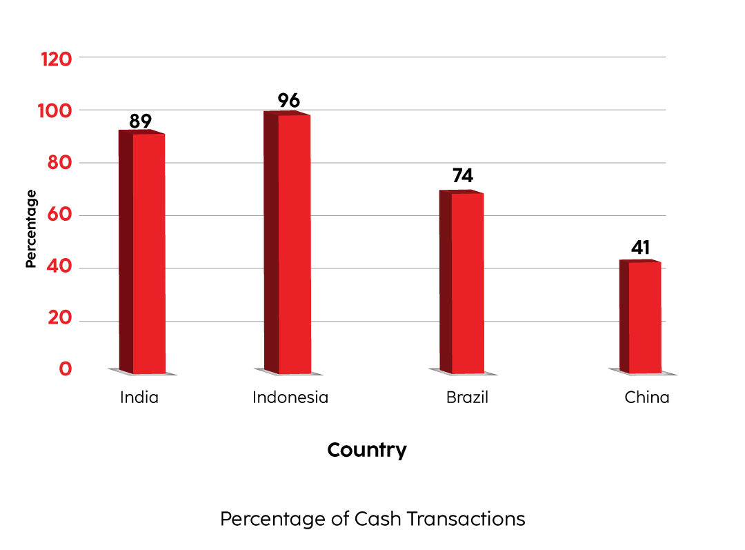 In 2020, about 89 % of all transactions in India by volume were estimated to be cash-based, down from 100 per cent in 2010, an October 2020 McKinsey report shows. Among emerging economies, India was second after Indonesia (96%), and ahead of Brazil (74%) and China (41%).