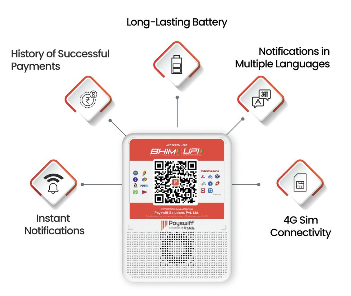The SoundBox is SIM card enabled and supports 9 Indian languages (2 languages accommodative), so that the merchant can hear the “Sound of Money” in their preferred language. A loud and clear voice payment confirmation is heard whenever a customer completes a successful transaction by scanning the QR code.